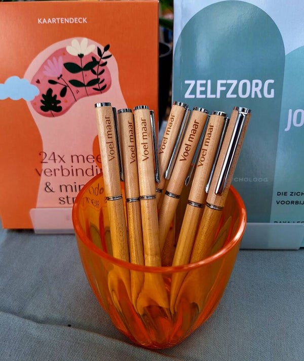 Deze gegraveerde balpen, gemaakt uit hout, herinnert je eraan dat gevoelens er echt mogen zijn.